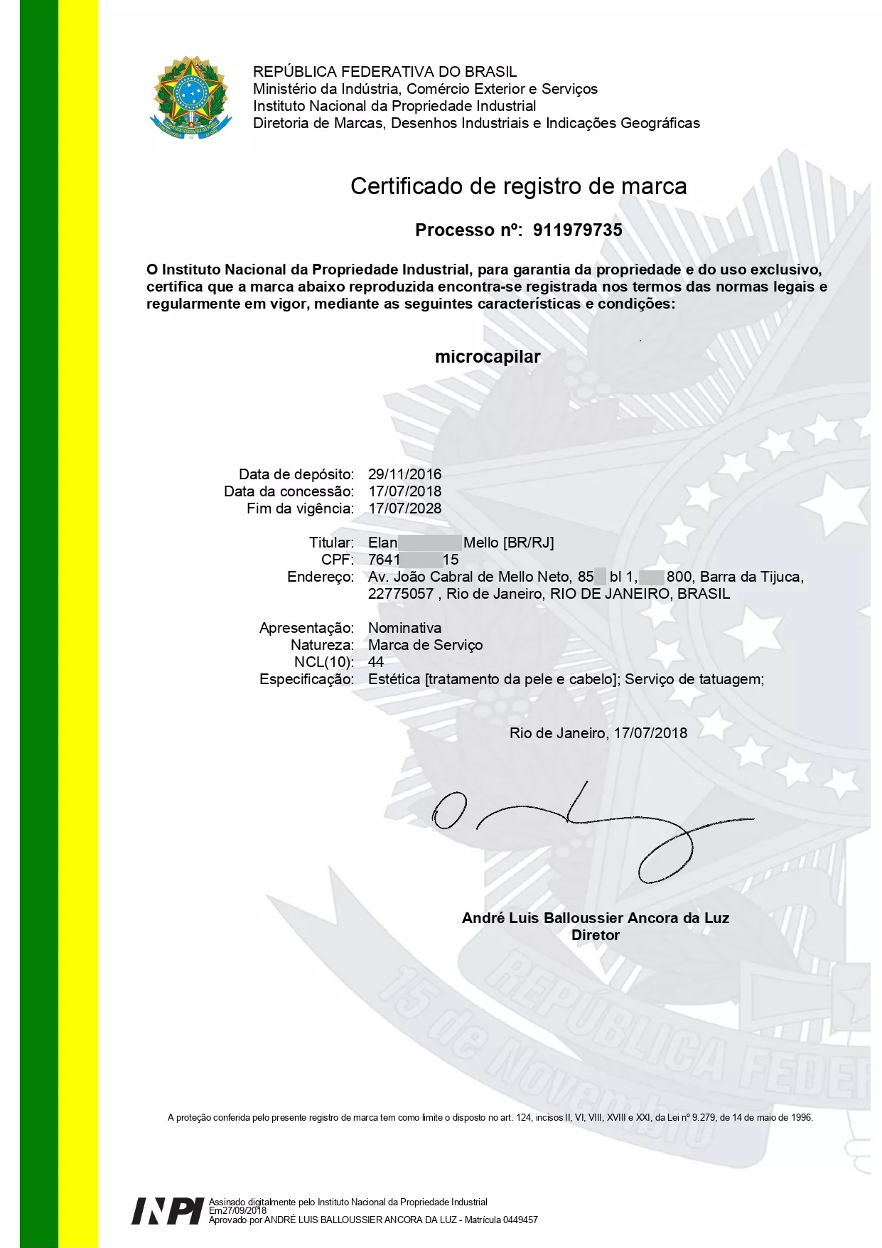 *É importante destacar que Microcapilar® é uma marca registrada no INPI do Brasil e na Europa em Portugal, tendo como detentor Elan Mello. Apenas a nossa clínica tem autorização para utilizar esta marca em procedimentos destinados a camuflar e tratar a calvície. Qualquer outro uso da marca é indevido e passível de punição conforme a legislação.