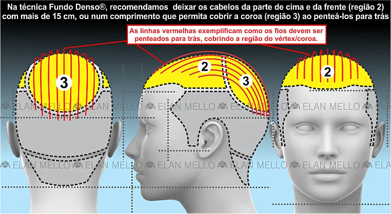 - Na Fundo Denso®, truques de penteado melhoram a cobertura. Ex: no vértex com poucos fios, mantenha cabelo da frente e topo com mais de 15 cm para cobrir a região (fig. abaixo).